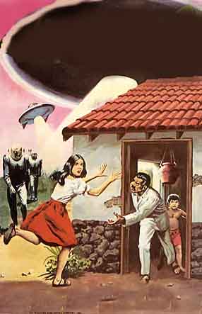 ikke bare tegneserier fra 50tallet -men idag tv og hollywoodfilmer - er fylt med skrekkhistorier om "romfolk" som skal "ta oss" - et effektivt medium for å skremme den uvitende masse om temaet - slik at den skjulte (penge-)makt kan fortsette sitt slaveri av den uvitende menneskehet. MEN DETTE KUN INTIL DE ÅNDELIG SETT VÅKNER OPP og dette skjer gradvis i denne tiden da mer VÅKNE mennesker inkarnerer her på jorden.