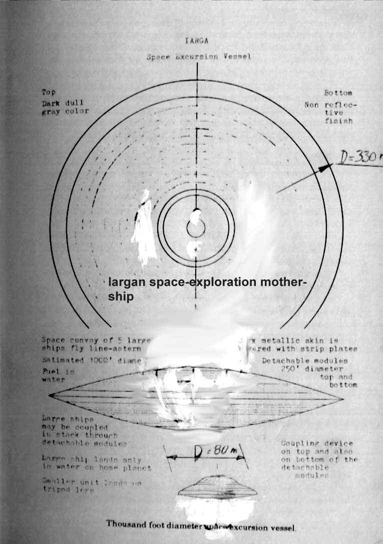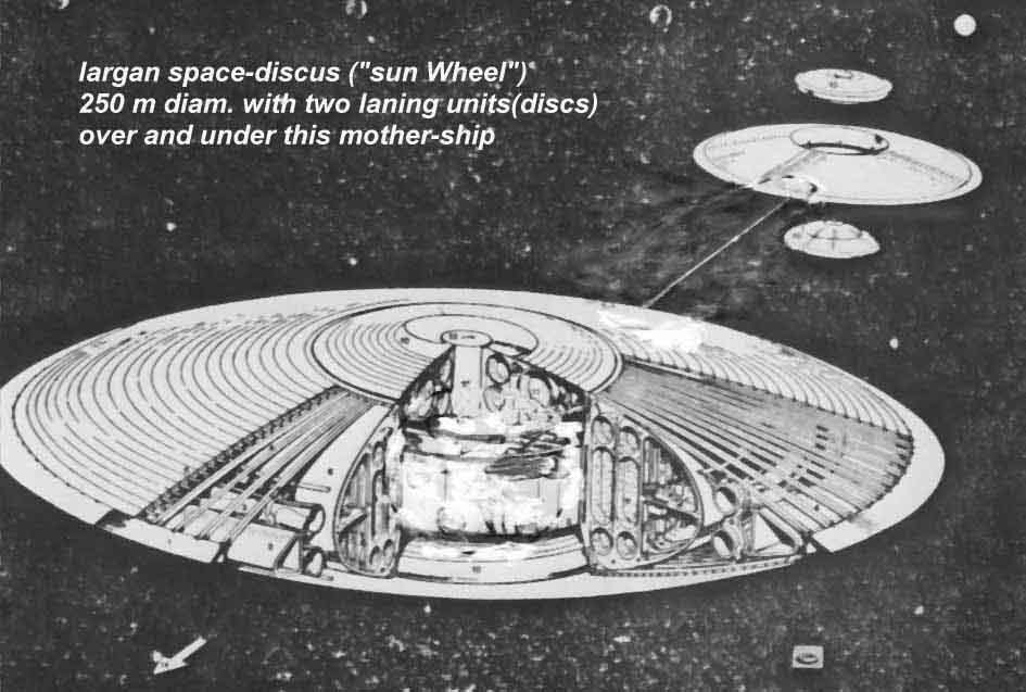 "We wish that were true! For spaceships that travel at relative speeds, space is not empty enough and not only streamlining but armor plating is also necessary. You have seen our ship and can see that armor is not a useless luxury. They have no windows; they are heavy, armored projectiles, whose strength comes from the discus form. (comment: other cosmic races for ex. Pleiadians from planet Erra (Semjase..) - seems to have developed a system with magnetic protection shields, which apperently serve the same purpose as here described. But it seems as these beeings - Iargans -dont travel interdim./through jumps in hyperspace, as the Erra-siv. describes. And because of that - their spacetravels seems to take very long time as will be said later in the text. In earlier times the pleiadians/our ancestors from the system of Lyra, also had these "first generation space travels", then the trips took very,very long time. - R:ø.remark)