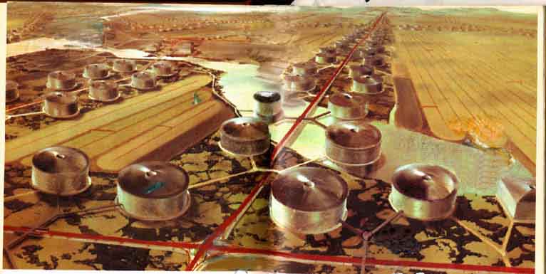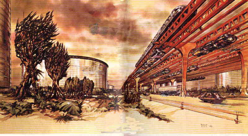 (text for painting-image of Iargan city, page 102-103 in the book) The dwelling units, great covered rings, over 900 feet in diameter by nearly 300 feet high, housed about 10,000 people per unit, and included all services and facilities of all kinds for that many individuals. They were arranged in rectangular formations of 36 ring-complexes per "city" giving a population density of about 6,000 per square kilometer. The strange vegetation has evolved to withstand the heavy gravity and the high winds that prevail here. With only a 10% land surface available on this planet high density living became a necessity and developed efficiently. The strange vegetation has evolved to withstand the heavy gravity and the high winds that prevail here. The fully automated robot rail transport system operated with frictionless efficiency, moving vehicles of many sizes and configurations at high speeds.
