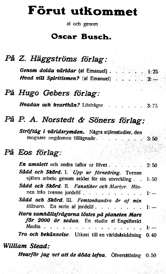 I allmänhet är nog så förhållandet, men i alla tider hafva enstaka siare ägt förmågan att blicka in det fördolda, och särskildt i våra dagar har för mottagliga sinnen en liten flik lyftats af det täckelse, som skiljer den osynliga världen från den synliga. I alla land hafva också budbärare från andra sidan skyndat att genom de medel, de kunna förfoga öfver, gifva människorna del af sina erfarenheter.  Littera­turen är rik på dylika vittnesbörd.