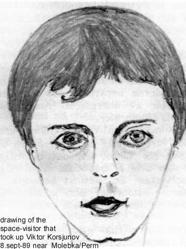 Då var de redan över Östersjön och flög söderut. Virve såg just Abruka-ön, när farkosten stannade - de hade redan flugit i cirka tio minuter. Men nu började flygmaskinen plötsligt accelerera. Med en enorm fart flög den genom molnen (moln/tåke- oppleves ofte i forbindelse med dimensjon-hopp, teleporterings-sprang, jf andre slike tilfelle.R.Ø.anm.) och sedan var planeten Jorden borta. Det var helt mörkt utanför rymdfarkosten. Under tiden utfrågade han Virve. Han ville bland annat veta vilka färdmedel hon använde och vad hon sysslade med. Virve berättade att hon vanligtvis cyklade och arbetade vid kolchosen. Resten av restiden var ytterst kort - högst fem minuter. Totalt alltså bara en kvart. Snart landade farkosten på en annan planet. Där fanns det grönt gräs överallt, däremot inte träd. Men himlen var blå. Det tycktes vara gryning - i alla fall en mycket tidig morgon. Någon sol syntes inte till. Här och var fanns några buskar. Hon såg en bred vit landsväg. Vid vägen låg en mycket lång rad låga runda likadana hus med platta tak. De flesta fönstren lyste. Det fanns mycket folk ute. Här och var syntes också grå färdmedel, som påminde om våra minibussar men utan hjul. Några män tycktes laga en sådan farkost. De leviterade ut från rymdfarkosten, som svävade ovanför gräset. Det var en mycket härlig och väldoftande luft på denna planet. Hon njöt av att inandas den. Han, som följde henne, märkte det och frågade om det var något särskilt hon kände. Virve sade att hon tyckte mycket om luftens behagliga doft. När han tillsammans med Virve hade landat på landsvägen, började andra ute på gräset ropa och springa mycket fort mot dem. De tycktes ha roligt. Virve blev rädd för dem. Någon blåste i horn och började tala till dem med sin gnisslande röst. Folk lugnade ned sig, och stannade på andra sidan av vägen, ropandet upphörde. Det syntes tusentals personer överallt. Alla hade likadana mörkbruna overaller på sig. På fötterna hade de stövlar. Alla såg ut som jordbor. Virve ville plocka upp en sten för att ta den med sig och visa för sina barn. Men vägen var liksom asfalterad med en vit massa. Det fanns inga lösa stenar. Ufonauten undrade vad hon letade efter. Virve förklarade att hon ville hitta en sten. Rymdvarelsen begrep inte varför hon behövde en sten. De hade gått kanske ett hundratal meter, när de kom fram till ett hus, som låg avskilt från de andra. Framför huset växte svarta blommor. En väntande manniska på trappan frågade Virves följeslagare om kvinnan hade förts dit mot sin vilja, eftersom hon var halvklädd. "Nej, nej."' sade Virve. Följeslagaren försäkrade Virve: "Det gör inget att ni har nattlinne på er... Var så god att gå in:" De gick in genom den vita dörren. Det var ett rätt stort rum med beigefärgade väggar och brunt glänsande golv. Det krumträformiga fönstret saknade gardiner. Fönsterramarna var vita. Mitt i rummet stod det ett runt bord. Vid bordet satt tre människor. Där fanns endast gungstolar. Den fjärde gungstolen var ledig. Det stod ytterligare två långa vita folk i rummet. Tillsammans med följeslagaren fanns det i lokalen totalt sex "rymdvarelser". De alla var klädda i bruna overaller. Virve ville lämna sina tofflor vid tröskeln, men följeslagaren sade att det inte behövdes. Han bad henne att sätta sig vid bordet. Rummet var upplyst, men inga lampor syntes till. Överallt på väggarna fanns det olika skåp. Hon satte sig vid bordet. En äldre man med bruna ögon och glasögon började vänligt tala med henne på ryska, sedan en mening också på finska. Då sade följeslagaren att kvinnan var estniska och att man borde tala estniska med henne. Då sade den äldre mannen: "Nu pratar vi om det som sker på Jorden." Virve berättade att alla i Estland dirömmer om frihet och självständighet. Men Moskva motsätter sig detta. Också Lettland och Litauen vill bli självständiga. "Men kan ni bli fria?" undrade den äldre mannen.. "Vet inte. Kanske om ett par år ser vi om det är möjligt. Men det kanske blir våldsamheter då." "Nej, det blir inga våldsamheter. Men om det blir det, så är vi beredda även på det," avslöjade han och fortsatte utfrågningen. "Vill alla i Estland att landet blir självständigt?" "Alla," försäkrade Virve. "Även ni?" ''Även jag:'' Sedan frågade mannen om hon trodde på Gud. "Det gör jag. Men jag vet inte, om Han verkligen existerar." "Existerar, existerar," sade han allvarligt och nickade självsäkert som om han verkligen visste vad han talade om. "Hur har ni det med livsmedel?" "Inte så illa. Vi klarar oss. Jag själv har boskap också." "Men det blir bara sämre med tillgången på livsmedel:" førutsade mannen. Så blev det också. Medan utfrågningen pågick antecknade en bredvid Virve allting som sades. Han använde något slags hieroglyfer, som oftast påminde om hjärtformiga symboler. Då och då lämnade han mellanrum. Två stående av dom liksom filmade allting med några appaater, som Virve uppfattade som kameror. Samtalet varade länge. Hon trodde att det hade gått flera jordiska timmar. I fönstret hade det blivit betydligt ljusare. Himlen var nu ljusblå. Virve sade att hon nu måste återvända, då det snart var dags att mjölka korna och ta hand om djuren. "Ja. Förlåt oss. Men får vi först ställa bara ytterligare några frågor?" "Var så goda:" sade Virve generöst. "Har ni även tidigare haft med sådana som oss att göra? Ni verkar vara så modig och pratsam." "Nej. Men man har berättat om er i radio och TV. Det hävdas att man besöker oss från andra planeter." "Har man berättat dåliga saker om oss?" "Nej då: Bara bra saker: Man har berättat att det kommer olika varelser till Jorden, både långa och korta. Till och med gröna varelser." (vel, det må være i øst- her i det usa/nato-kontrollerte vesten er det kun snakk om latterliggjøring; "små grønne menn"/hehehe, - samt en m