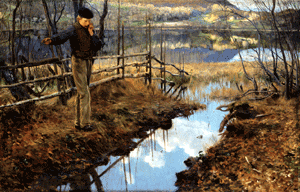 "A nei, hå vakkert det no er. Marka holder på å pynte se i sin grønne dragt, og sjå bjørka, du, hå blug ho står der, kvit på leggjom og letter på sitt grønne skjørt for ikke å væte det i snogvatnet. Også gråna og furua ha pynta se mæ friskere grønt, og jeg kjender det på lugten, hås'n heggen stræver for å få fram sin kvite blomsterpragt. Hør gauken, håssen han roper på sin make, og alle de andre fuglan. Det er spellemannan det i vårens bryllaup; de spiller og synger af glæde for friheten og sommeren og takker på denne måte sin skapar. Den herlige sol med sit lys og sin varme har løst alt fra vinterens mørke og bånd, og bækkjan de skvaldre å snakke om det so hugnasamt og glade. Gud være tak." Så stod han lidt og tænkte, og imens lyste hans ansikt op af dyb, indre glæde, og han sa: