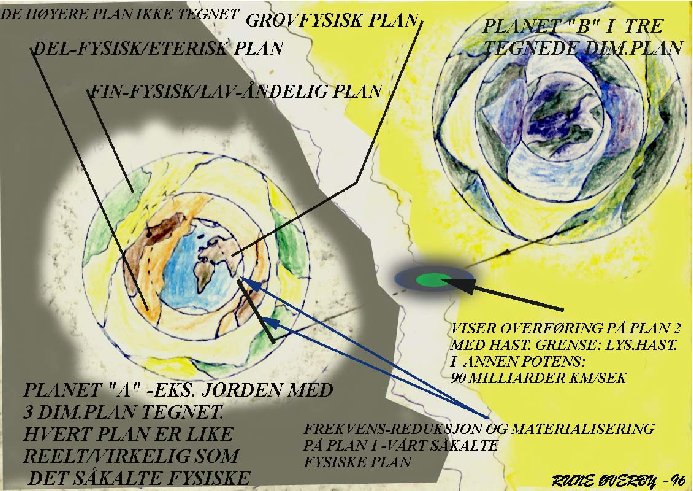VIEW OF THE UNIVERSE Surrounding the earth was a faint bluish haze, fairly dense close in, but fading our altogether after a few miles. The earth rolled on, turning lazily like a hawk wheeling slowly in the sky. The Broad One said. "You are intent (er opptatt av..) upon Earth, yet the whole of your Universe is before you. Is it not worth a glance?" It brought us to life with a start, and we looked up. Above us was utter blackness interrupted with startlingly vivid points of light. Distant planets appeared sharply round and of many different hues, while on those nearer we could distinguish features of their surface. So that we could gaze upon the sun - the Broad One caused a dark shield to cover part of the screen. We saw the sun huge and clear, and the sight struck us with terror because we thought it was on fire. Vast tongues of flame leapt from its circumference, while its surface presented itself to us as a writhing mass, freely marked with dark blobs. "We have a base on what you call the Moon, "said the Broad One. "The Moon always presents one side to the Earth. Our base is on the other side and we are going there now." The filter was swung aside and we were able to gaze upon the blindingly brilliant face of the Moon, that airless world which still contains life deep beneath its surface. We approached it at a speed, which was so fast as to be quite incomprehensible to us, but there was no sensation of speed. "You have learned much about us," said the Broad One. "Yet upon earth people are taught that we do not exist. They have to be taught so because of the religious teaching that Man is made in the Image of God, and the people of the earth think that Man is the earth human. To day admit the possibility of Man on other planet, would be to prove the various religions wrong. Again, those who hold the power of life and death over nations, dare not let it be known that there is even a greater power, for to do so would be to lessen their hold upon their enslaved people."