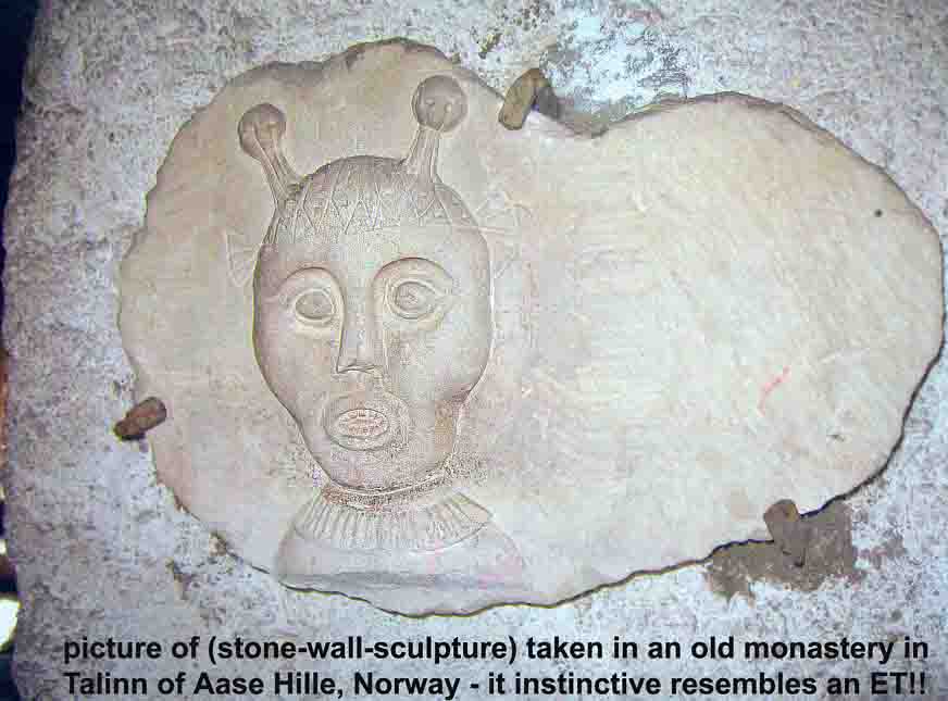 in many of the Rampa books - ex THE HERMIT - it is mentioned ETs with horn-like things on the head, but just this picture may also be on a helmet -like cap on this "ET".
