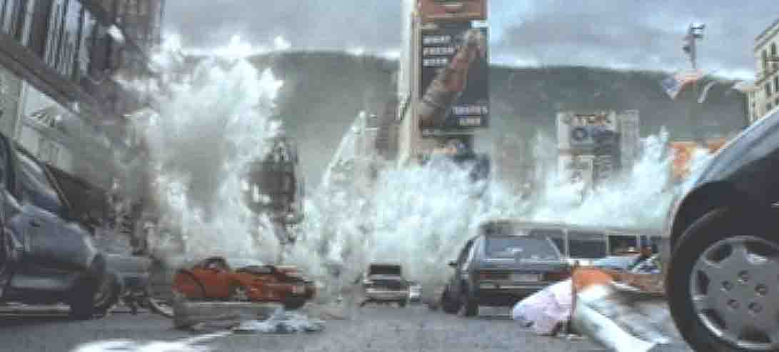 voldsomme flodbølger og jordskjelv etter at asteroider og ytre objekter fra rommet slo ned i verdenshavene og utløste kilometerhøye flodbølger som knuste alt på sin vei. Bildene her fra en katastrofefilm fra 90tallet.