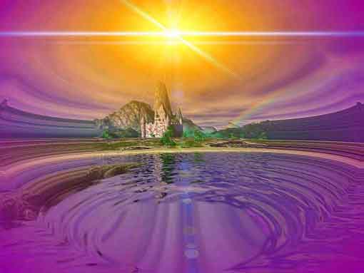 på de høyere plan der det er enklere og lettere å skape med ren tankekonsentrasjon, finnes de vakreste former og farger med en intensitet og indre glød som det ikke er mulig fullt ut å gjenskape i jordens nåværende vibrasjons/frekvensnivå. Bildet over er malt av den fantastiske visjonære kunstner Gilbert Williams - som forteller at han allerede som barn hadde en evne til å motta bildeinspirasjoner fra "det kunstneriske astrale plan". Bildet er ikke fra boken som her omtales. Noen flere bilder fra samme kunstner lenger ned.