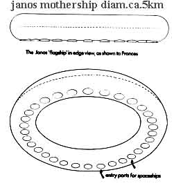 Power and Industry Electrical power was generated by nuclear power stations, different in appearance from ours; an example seen by Frances was aptly described by her as "like a gasometer inside the Eiffel Tower". There was a huge vertical cylinder of a dull grey material, supported only at four points of its upper circumference by a four-legged tapering pylon of bright shiny metal, composed of lattice girders with a criss-cross pattern, joined by a series of rings. The cylinder was suspended by the pylon in such a way that its lower end did not quite touch the ground, though it must have been very heavy. The pylon came together at its apex into a smoothly rounded cap. The scale was difficult to assess, for lack of anything to compare it with; Frances had the impression, however, that it was of very great size. She is almost certain that the fuel used was uranium; she does not remember that it was so named, but that was how she identified it in her mind. In view of what happened, it seems very likely to have been uranium. Of the industrial achievements of Janos, we can judge only by inference. However, it is impossible not to be deeply impressed by the sheer magnitude of the task of building a space fleet to carry, over such a vast distance, the entire population of the planet, numbering many millions. How long this task required, we do not know. We have been told that the average working day on Janos was much shorter than on Earth; and that most of the work was done by machines and computers. The creation of just one spaceship such as the one visited -regarded by the Janos people as a 'small' ship - argues an enormously advanced and complex industrial organisation; and its dependence upon electrical energy no doubt reflects the electricity-based energy-pattern of Janos industry. There are many such ships, some of them of great size: one in particular, which I have called the 'flagship' of the fleet, was shown to Frances by a technique which I have described below under Telepathic Communication. It is of really stupendous size, and appeared to be in the form of a ring; but because Frances saw the ring edge on, she could not tell whether it was filled in as a disc, or whether it was just an open annulus (ringformet). Set around the outer rim, in a circular pattern, were many huge entry ports for spaceships to come and go. Despite its high technology, there is much that is familiar about Janos spaceships, as exemplified by the one visited. There are bolts, for example, though with octagonal bolt-heads, not hexagonal. There are voltmeters. There are things that strongly suggest transformers. There are video screens, for displaying technical data as well as for showing films and for monitoring external cameras. There are powered ramps, which move forward automatically when a person steps on them. Somewhere out of our sight, in the spaceship, there must be workshops, stores, drawing offices, laboratories, computer rooms, test benches, repair and maintenance equipment, as well as rooms for living and social life. On the planet, on a vastly greater scale, the same things must have been there; and we can assume that the great ships of the fleet carry with them the entire range of industrial equipment of Janos, as well as its population.