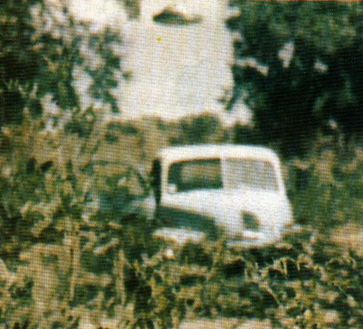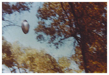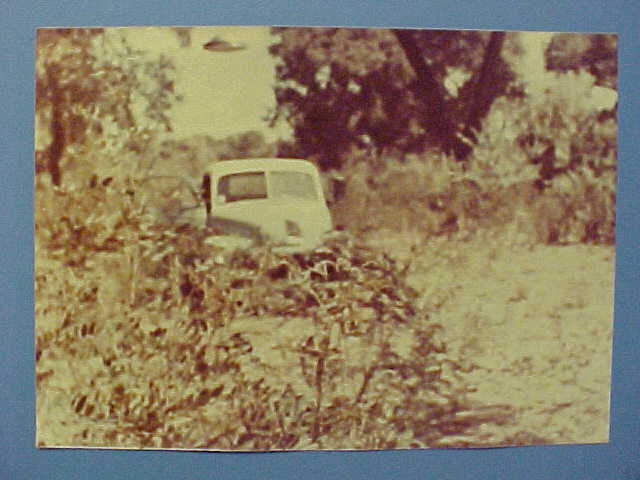 After a long conversation, the space-people re-entered their spaceship and it took off and hovered and maneuvered about the area for some time. At one point it hovered about 300 feet above the pickup truck and Villa saw it rise slowly from the ground to a height of three or four feet and then slowly settle back down again. The spacecraft then flipped up on its edge with the under part rotating, and traveled sidewise up and down at different speeds. The distortion on the leading edge of the craft in photo number 3 is caused by the rotation of the lower half of the ship and the swaying branches of the trees which were put into motion by a big rush of wind.